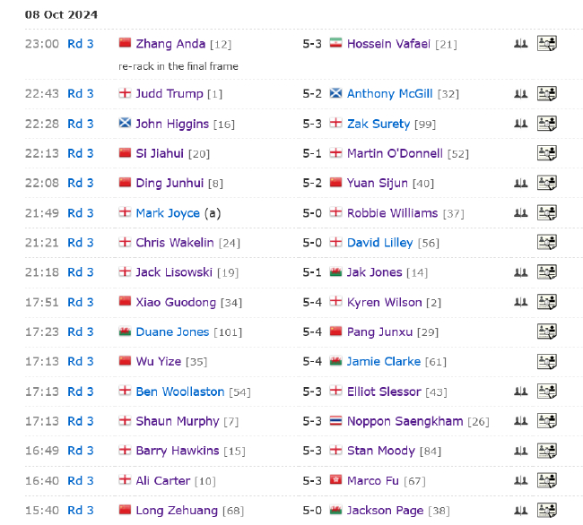 同时段中,卫冕冠军、头号种子贾德-特鲁姆普在对阵苏格兰选手安东尼-麦克吉尔的比赛中,开场率先打出1杆50+,先胜一局。苏格兰人打出1杆破百和1杆50+,连胜2局,大比分2-1反超。随后,“王牌君”再轰1杆60+,连胜4局,大比分5-2晋级正赛16强。